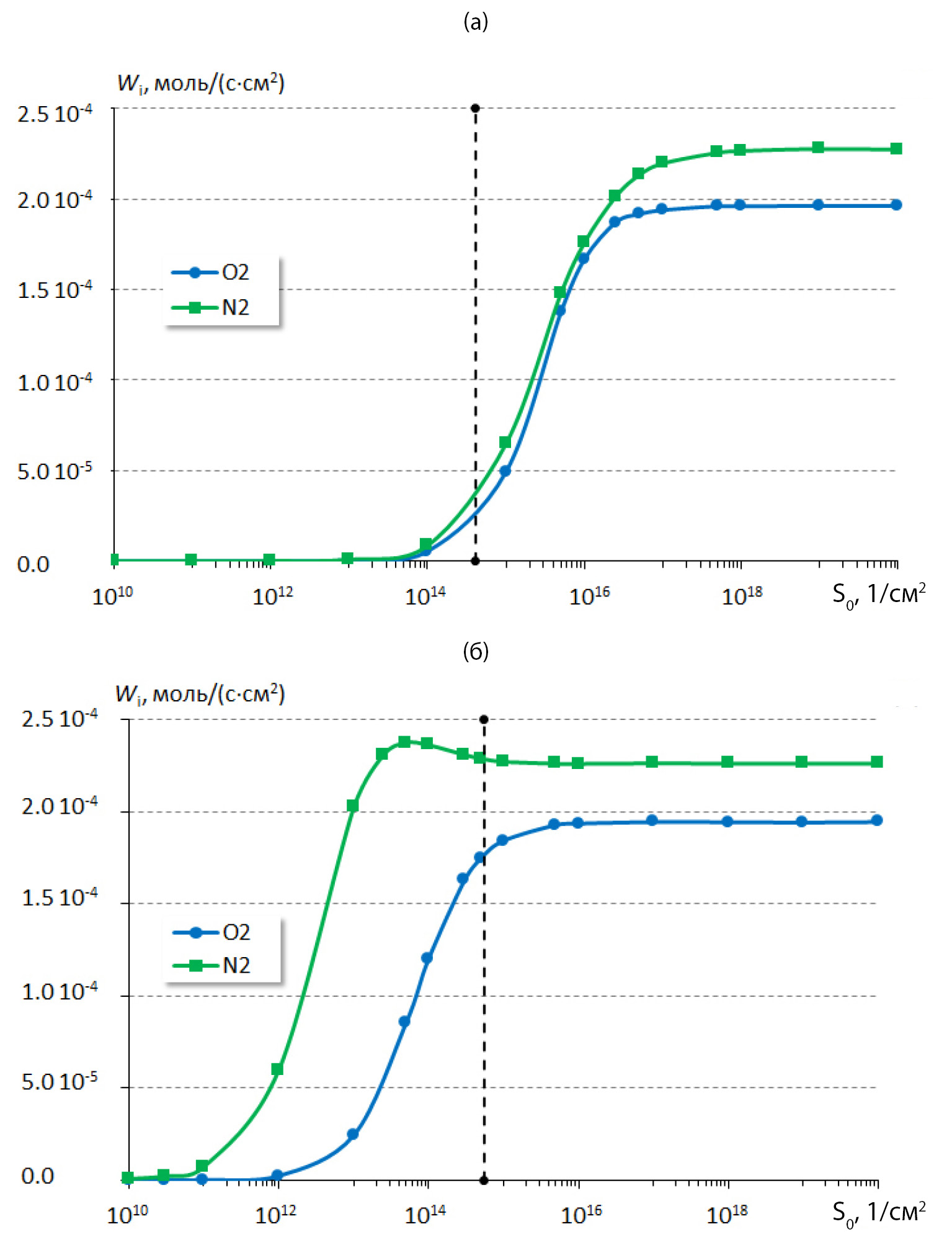 Зависимость концентраций газофазных компонент в точке торможения от плотности центров адсорбции для двух рассматриваемых моделей катализа показана на рис. 7. Вертикальные штриховые линии имеют такой же смысл, как и на предыдущем рисунке. Для поверхности SiO2 константы скоростей адсорбции и рекомбинации кислорода и азота имеют практически одинаковые значения (см. таб. 2), что объясняет очень похожее изменение газофазных концентраций при увеличении параметра S0. При использовании модели катализа для Cu2O, в которой константа скорости адсорбции азота в 15 раз больше константы скорости адсорбции кислорода, а константа скорости рекомбинации азота только в пять раз меньше константы скорости рекомбинации кислорода (см. таб. 2), активация процесса поверхностной рекомбинации азота начинается существенно раньше и протекает более интенсивно, чем рекомбинация кислорода. Аналогично ведут себя и скорости возникновения газофазных молекул на поверхности в результате гетерогенных реакций, что показывает рис. 8. При увеличении S0 скорости возникновения молекулярных компонент N2 и O2 для обоих материалов выходят на одинаковые значения, отвечающие идеально каталитическим граничным условиям.