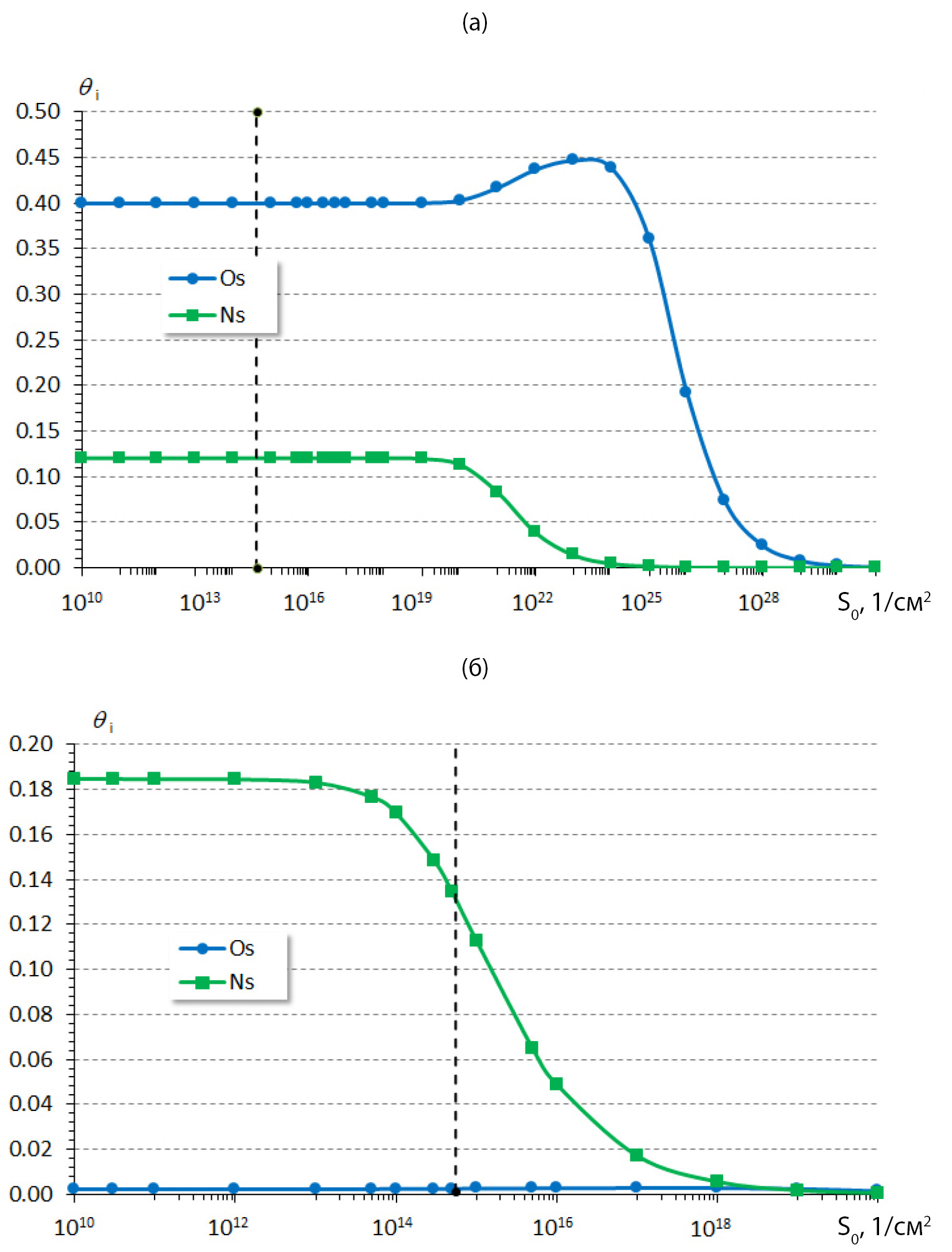 Приведенные значения газофазных концентраций для материала SiO2 еще недостаточно малы при S0 < 1019, чтобы степени заполнения начали уменьшаться. Они остаются практически постоянными во всем диапазоне изменения параметра S0. В то время как для Cu2O при значениях параметра S0 > 5 ⋅1013 степень заполнения θN резко уменьшается. При дальнейшем увеличении параметра S0 степени заполнения азотом и кислородом выходят на нулевые значения для обеих моделей.