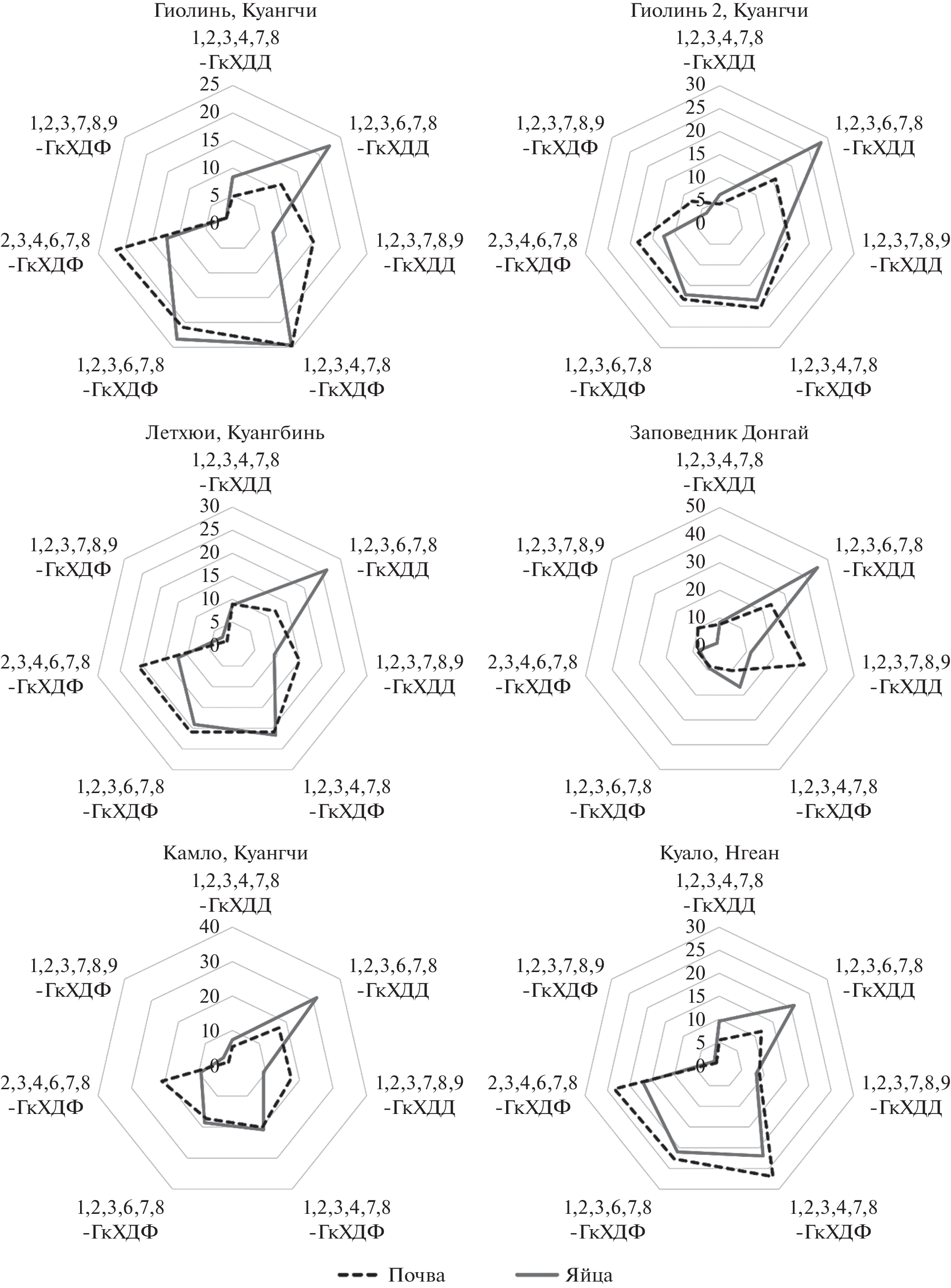 Проведено сравнение профилей ПХДД/Ф в яйцах кур на свободном выгуле и соответствующих почвах в частных хозяйствах Вьетнама. Основным направлением изменения профиля конгенеров ПХДД/Ф в процессе бионакопления в яйцах является относительное увеличение вкладов низкохлорированных конгенеров и снижение вклада ОХДД. Различия в профиле гексахлорированных конгенеров в яйцах и почве могут свидетельствовать о дополнительных источниках поступления ПХДД/Ф в яйца помимо почвы.