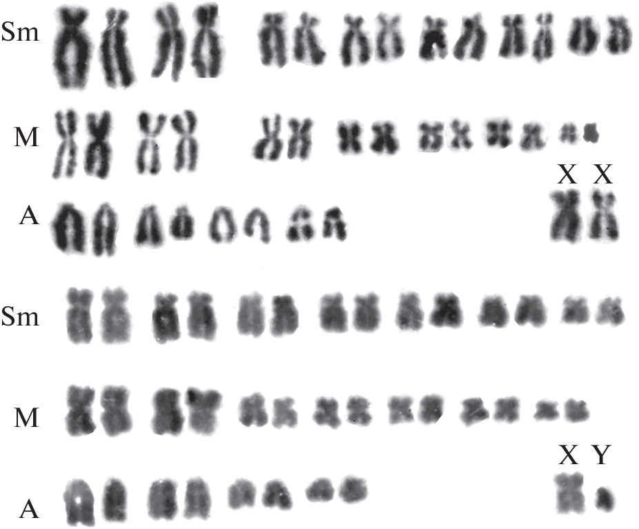 A revision of the original description of the karyotype of the sable Martes zibellina was carried out, data on the mitotic metaphase chromosomes of the female and male of this species and a comparison of their sets with those of closely related species of the genus Martes are presented. We also provide a description of the synaptonemal complex (SC) in the early – middle prophase of meiosis in sable spermatocytes. Comparative analysis confirmed the stability and similarity of the main cytogenetic parameters of sables and martens (2n = 38, NFa = 64–68, X is the average submetacentric, and Y is the smallest meta,-submeta,- or acrocentric). A small polymorphism associated with the representation of one- or two-armed smallest elements of the diploid set of chromosomes was revealed. These features are of little use for the development of intraspecific taxonomy of sable, but can be used to reveal phylogenetic relationships at the species and generic levels, as well as to identify the consequences of natural hybridization of closely related species of the genus Martes.