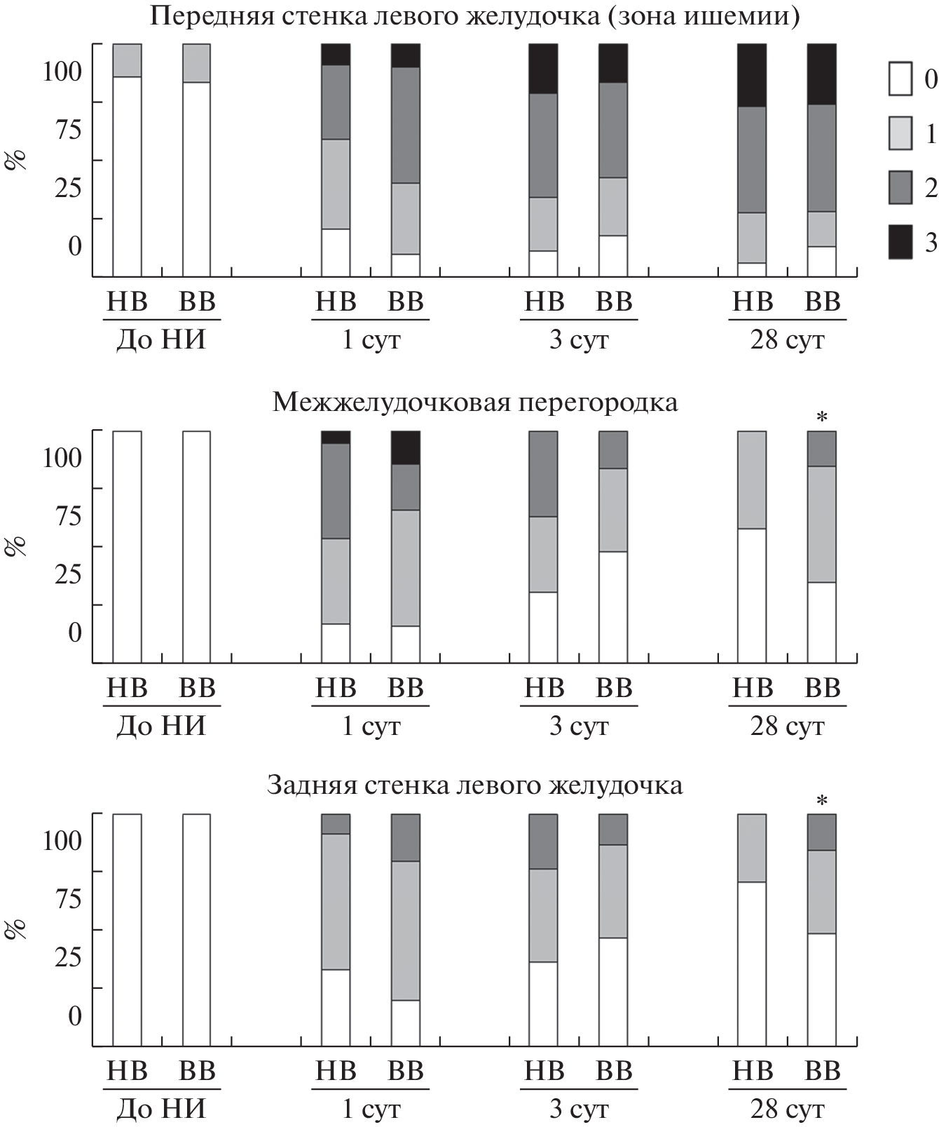 Методом анализа вариабельности ритма сердца (ВРС) у крыс оценивали связь исходного уровня общей ВРС и регуляторные изменения в работе сердца до и на 1, 3 и 28 сут после моделирования необратимой ишемии (НИ). По уровню общей ВРС выделили две группы крыс: с исходно “низкимˮ и “высокимˮ уровнем ВРС - группы НВ (SDRR = 5.0 мс) и ВВ (SDRR = 8.2 мс). НВ и ВВ крысы по-разному реагировали на холодовую пробу до и после НИ. Через 3 сут после НИ у НВ крыс была лучшая сохранность вегетативной регуляции сердца, а через 28 сут – меньший размер поражения миокарда и смертность. У ВВ крыс в очаге ишемии было выше число тучных клеток, а в зоне, незатронутой ишемией, – выше доля дегранулированных клеток, чем у НВ крыс. Таким образом, исходное состояние вегетативной нервной системы определяет развитие инфаркта миокарда у крыс.
