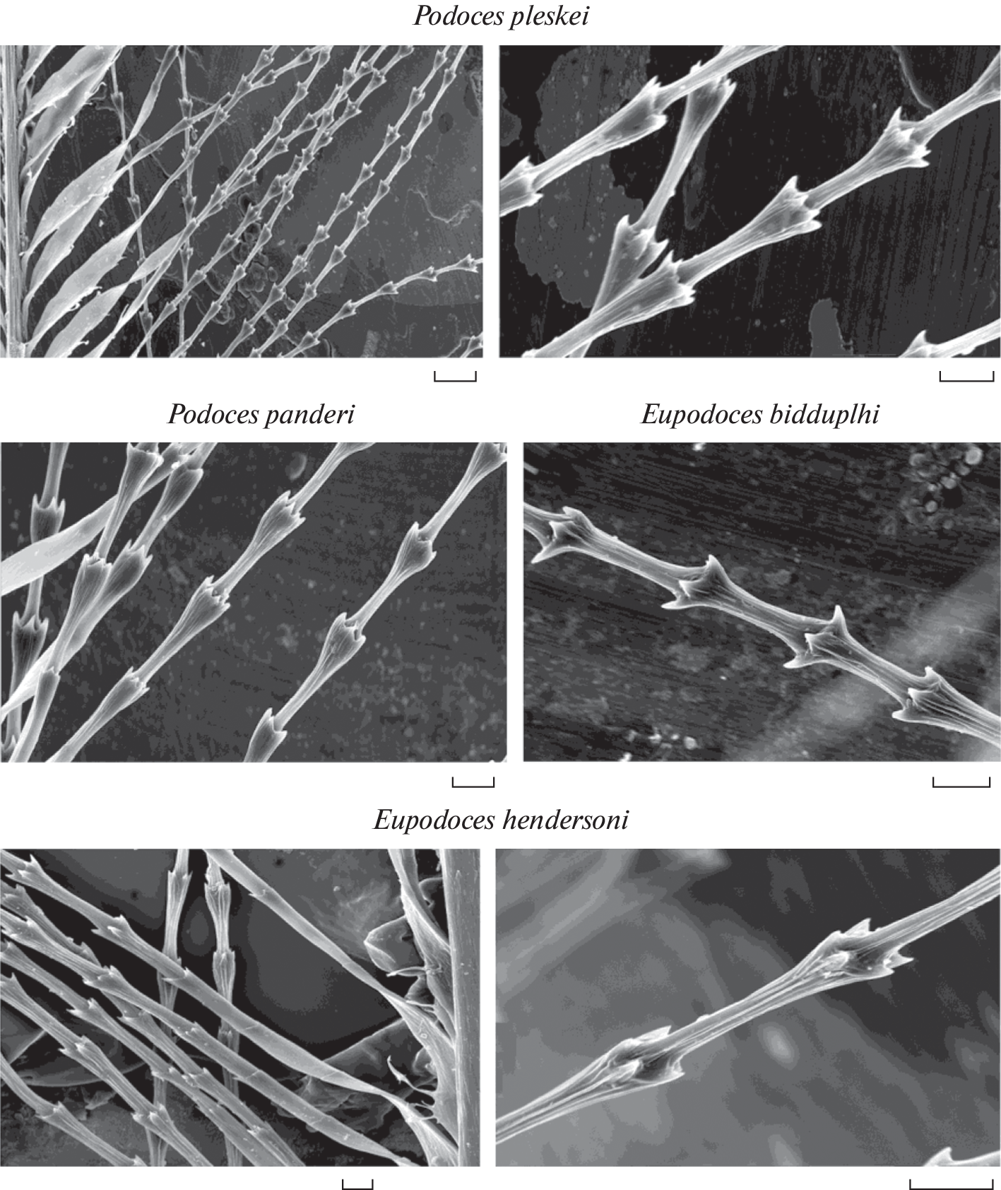 Using scanning electron microscopy, new data on the microstructure of the definitive coverling feathers of all four species of ground jays Podoces pleskei, P. panderi, Eupodoces hendersoni and E. biddulphi and eight other species of Corvidae were obtained: Ptilostomus afer, Garrulus glandarius, Perisoreus infaustus, Corvus cornix, Cyanopica cyana, Nucifraga caryocatactes, Pica pica and Pyrrhocorax pyrrhocorax. Comparative morphological analysis involving previously published data on the microstructure of the pen-feathers of these species, as well as Corvus monedula, C. frugilegus, C. corax, revealed a number of feather microstructures specific to ground jay species, as well as differences between Podoces and Eupodoces, which confirms their genus status, possible relationship with G. glandarius and Pt. afer, as well as the preservation of ancestral features in P. pleskei.