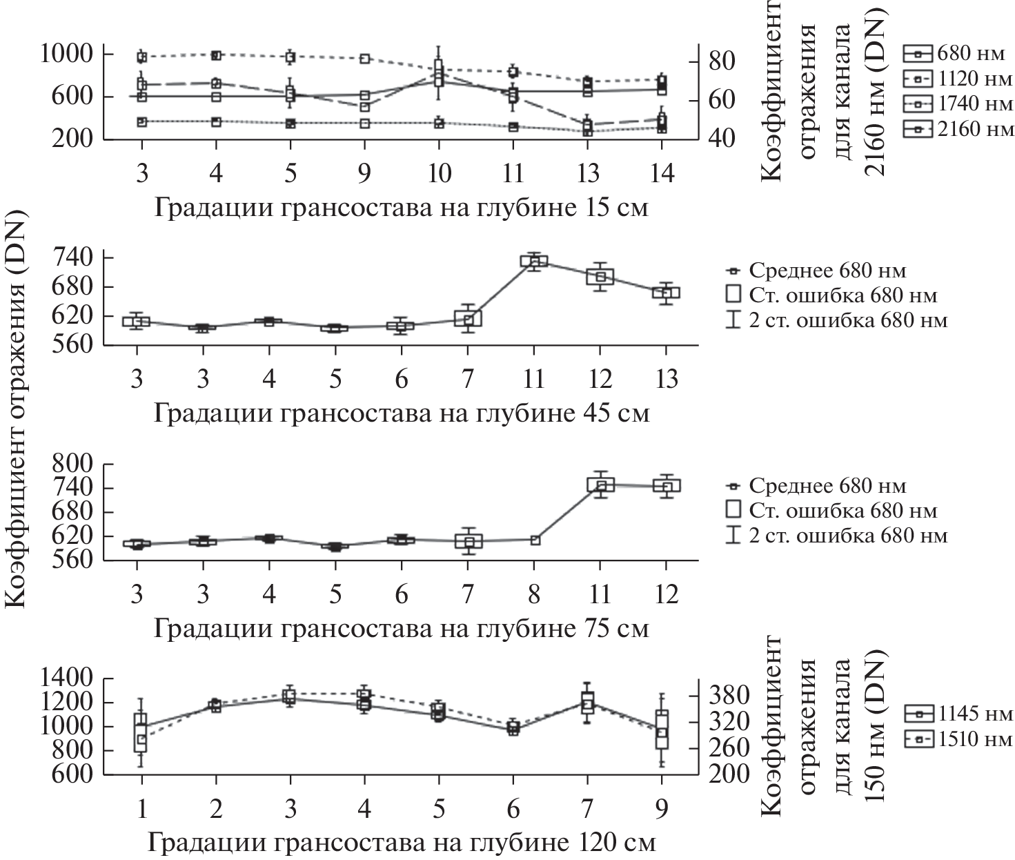 It is studied the representation of the texture and color of the soil on the Mansell scale, measured to a depth of 135 cm with an interval of 5 cm on the transect (length 6 km) with a step of 20 m, in hyperspectral data of the Hyperion instrument for 9 measurement periods from January to September. It was found that satellite image for May 24 is most closely related to all the characteristics under consideration. For the soil texture – the largest relationships are observed for depths of 7–15 cm, 45 cm, 75 cm and 120 cm; for color hue – 3–10 cm and 95–135 cm; for color value – 7–15 cm, 25–30 cm and 65–70 cm; for color chroma – 7–10 cm, 40–50 cm, 75 cm and 100 cm. The texture of soil is most related with wavelengths 579–702 nm and 529 nm, color hue – 641–691 nm, color value – 569–702 nm and 518–539 nm, color chroma – 569–702 nm, 508–529 nm and 732–763 nm.
