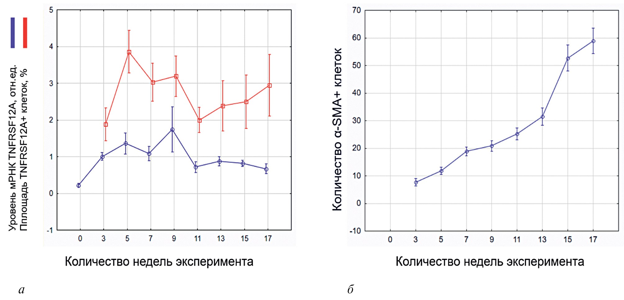 Рис. 2. Представлен график дисперсионного анализа: а – динамика изменений уровня мРНК TNFRSF12A и отношения площади TNFRSF12A+ клеток к площади среза. Представлен график двухфакторного дисперсионного анализа; б – динамика изменений количества α-SMA+ клеток в течение эксперимента