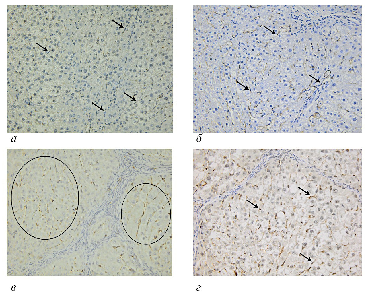 Рис. 3. Фрагменты печени крыс с индуцированным циррозом через 3 нед. (а), (б); 17 нед. (в, г) после начала эксперимента. Иммуногистохимическое окрашивание на TNFRSF12A, докраска гематоксилином Майера (а), (в). Иммуногистохимическое окрашивание на α-SMA, докраска гематоксилином Майера (б), (г). ×40 TNFRSF12A+ клетки в синусоидных капиллярах: а – стрелки; в – выделены овальными рамками; α-SMA+ клетки в синусоидных капиллярах (г); б – стрелки