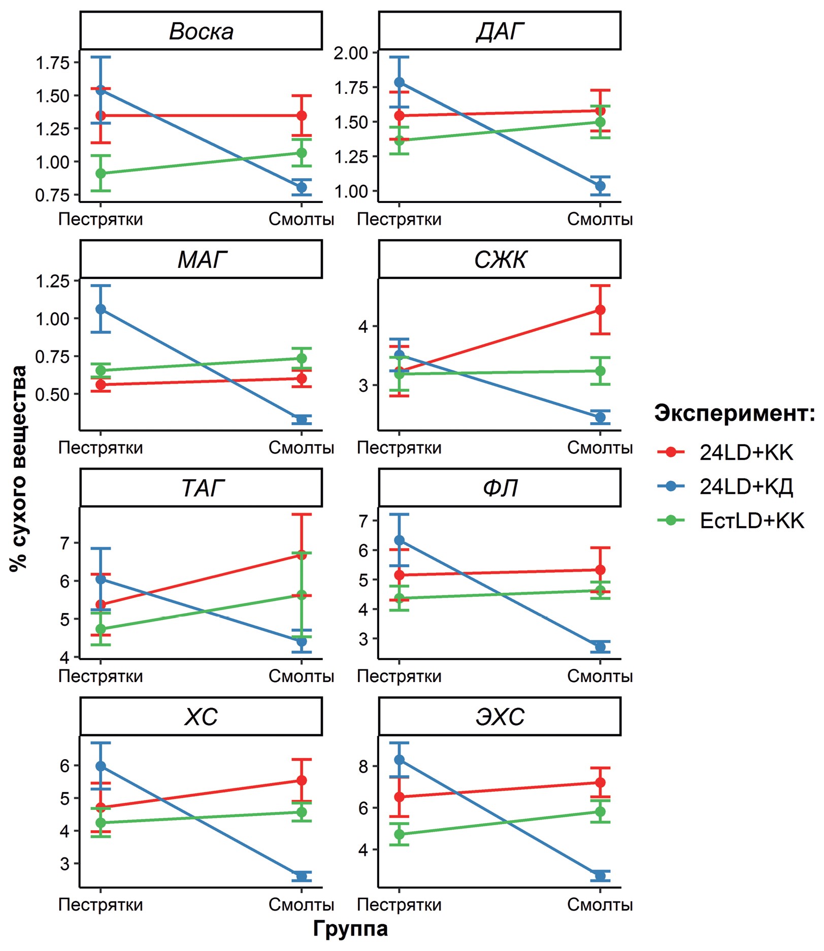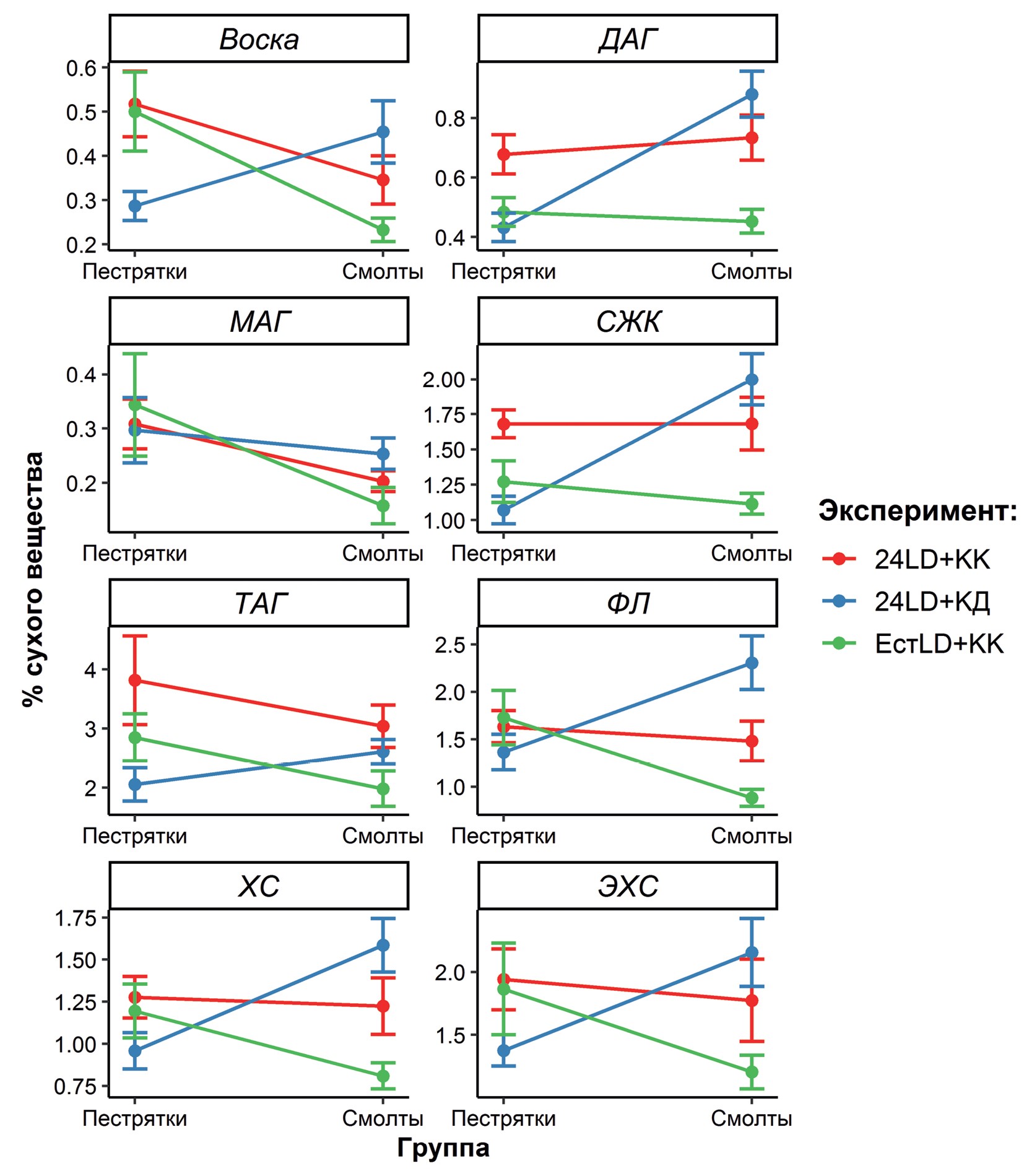 Не обнаружено достоверных отличий в содержании липидных классов в печени пестряток между группами 24LD + KK и ЕстLD + KД. Показано, что у рыб в группе 24LD + KД по сравнению с ЕстLD + KK достоверно выше содержание МАГ, восков и ЭХС. В печени смолтов выявлено достоверно меньшее содержание исследованных липидных классов в группе 24LD + KД по сравнению с 24LD + KK и ЕстLD + KД, за исключением ТАГ.