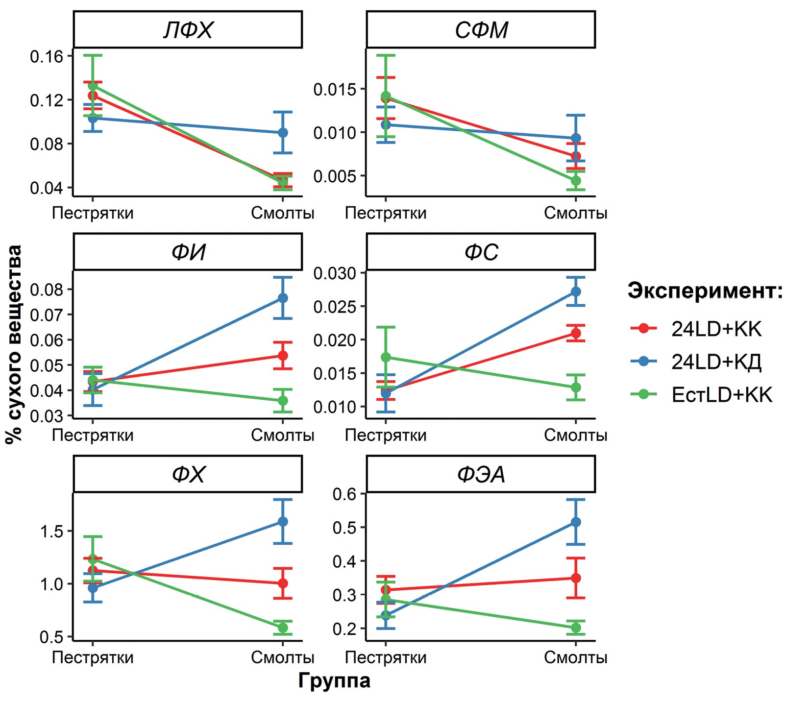 Среди фосфолипидов печени пестряток и смолтов, как и в мышцах, показано доминирование ФХ (1.69–4.14%) и ФЭА (0.76–1.52%). Не выявлено выраженной динамики основных фосфолипидных классов у рыб 24LD + KK и ЕстLD + KД. При этом в группе 24LD + KД у смолтов показано их снижение (достоверное для всех компонентов, кроме ЛФХ) (рис. 6).