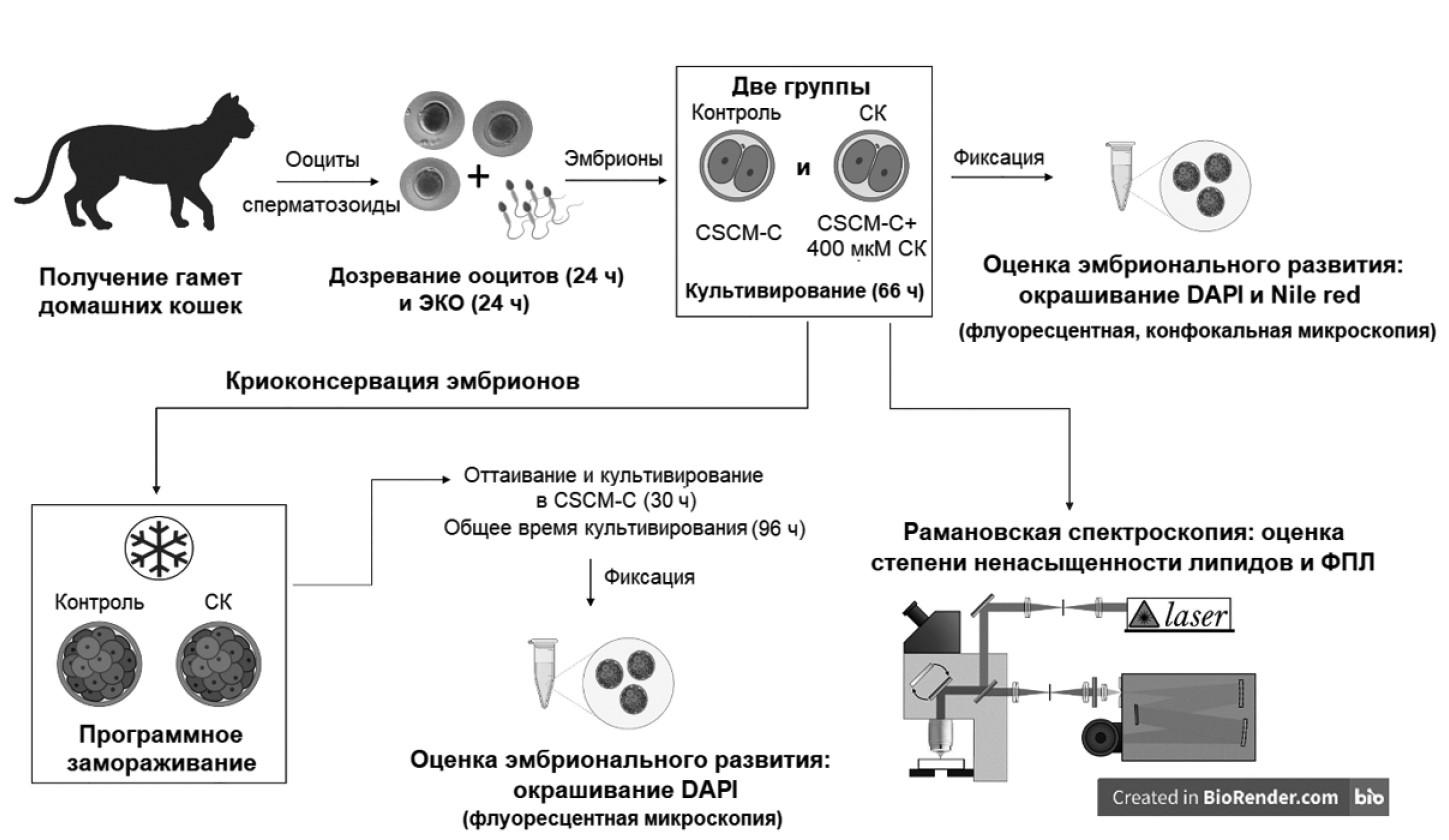 В работе на ооцитах домашней кошки показано, что во время их охлаждения внутриклеточные ЛГ подвергаются фазовому переходу и фазовой сепарации. После охлаждения более насыщенные липиды в составе ЛГ подвергаются фазовой сепарации раньше, чем ненасыщенные (Mokrousova et al., 2020а). В недавней работе на ооцитах домашних кошек было показано, что после добавления СК во время их дозревания in vitro и последующей криоконсервации при помощи программного замораживания, часть насыщенных липидов может оставаться в упорядоченном конформационном состоянии после оттаивания (Okotrub et al., 2021). Тем не менее влияние СК в ходе культивирования in vitro эмбрионов домашних кошек на их жизнеспособность после криоконсервации проверено не было.