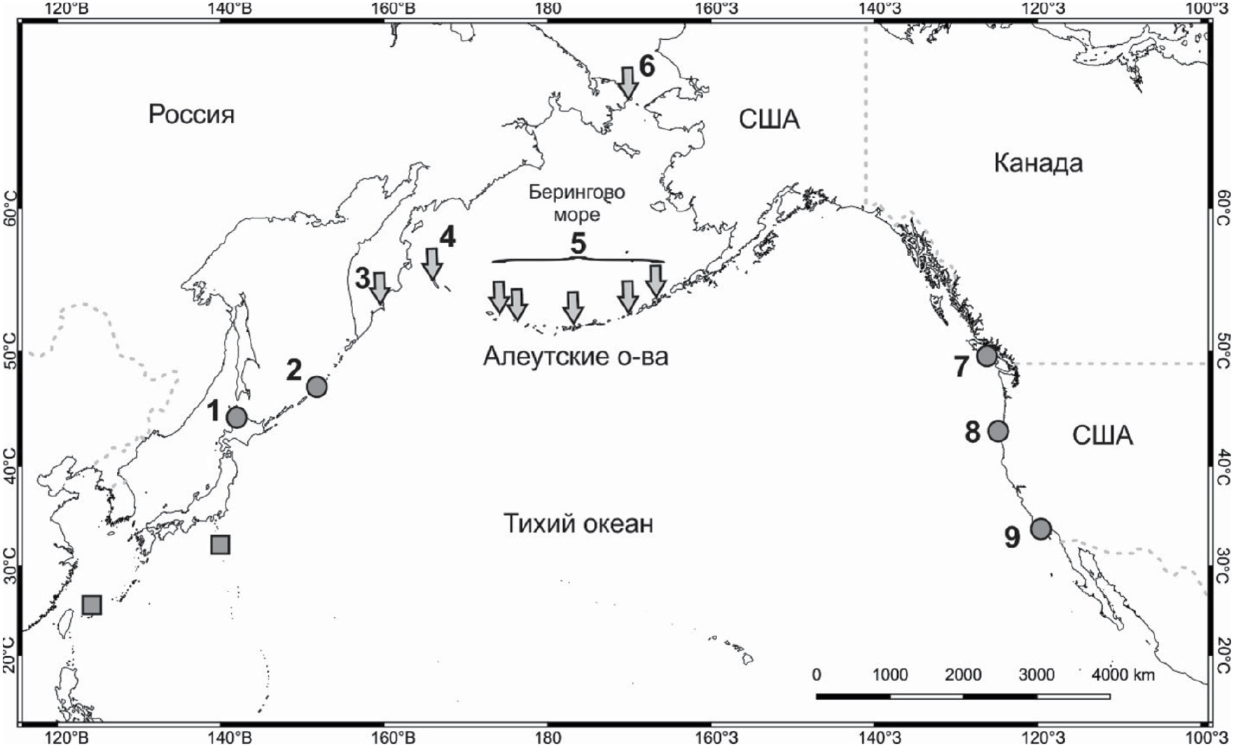 Рис. 1. Карта района исследований — Северная часть Тихого океана. Квадратами отмечены современные гнездовые колонии белоспинных альбатросов, кругами — районы, для которых известна изотопная изменчивость коллагена костей белоспинных альбатросов из археологических памятников побережья Северной Пацифики по литературным данным (Eda et al., 2012; Vokhshoori et al., 2019; Guiry et al., 2022), стрелками — районы с нашими данными по изотопной изменчивости коллагена костей голоценовых белоспинных альбатросов. Регионы: 1 — о. Ребун (Япония), 2 — Курильские о-ва (РФ), 3 — Камчатка (РФ), 4 — Командорские о-ва (РФ), 5 — Алеутские о-ва (США), 6 — Чукотка (РФ), 7 — о. Ванкувер (Канада), 8 — Орегон (США), 9 — Калифорния (США)