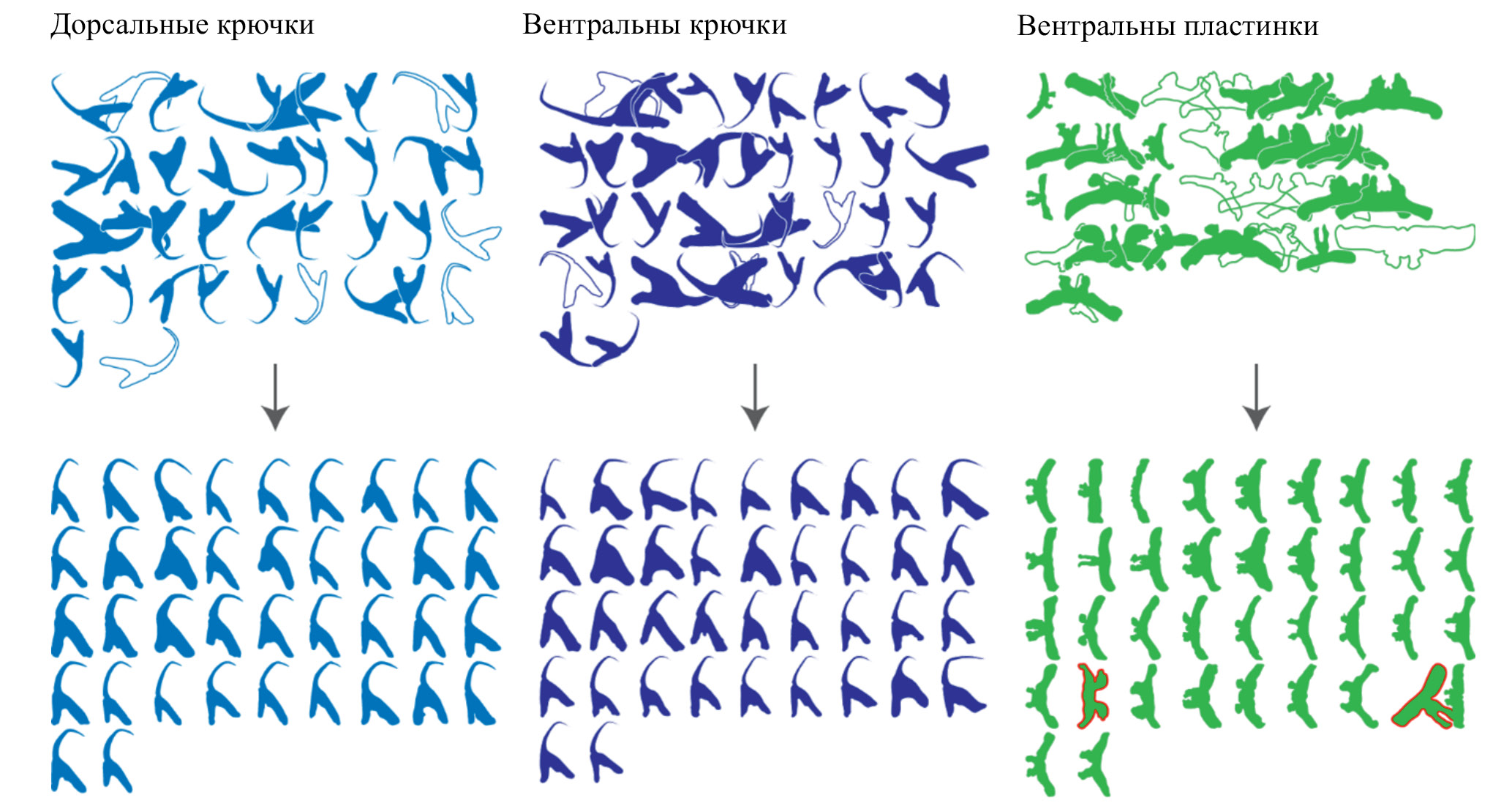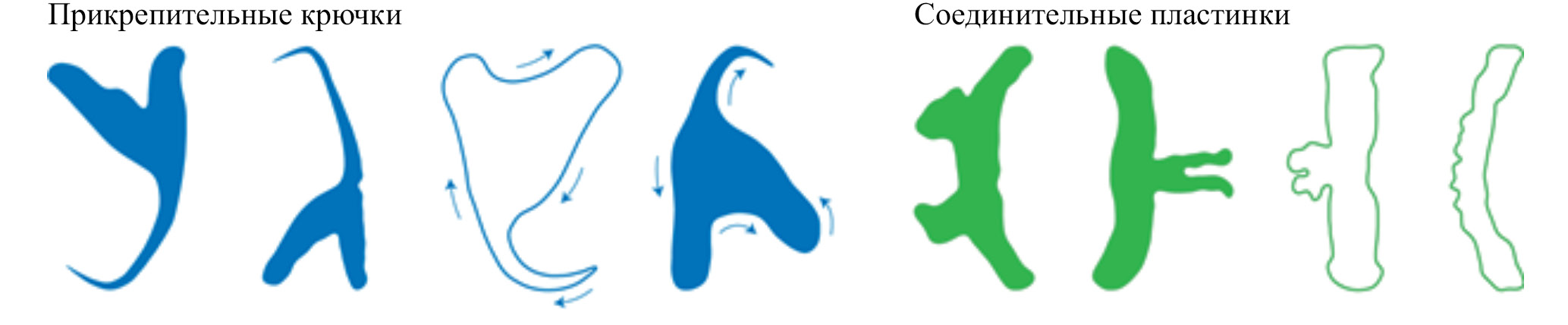 Материалом для работы послужили контуры прикрепительных крючков плоских паразитических червей рода Ligophorus Euzet & Seriano, 1977 из класса моногеней (Monogenea). Для работы использованы контуры 38 вентральных и 38 дорсальных прикрепительных крючков и 38 вентральных соединительных пластин особей 32 видов (рис. 2).