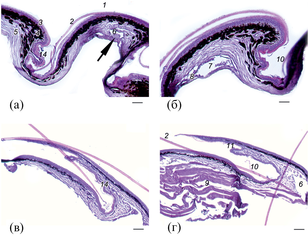 Рис. 3. Микроструктура брюшных щитков взрослой особи Darevskia dahli на сагиттальных срезах. Продольная кожная складка на вентральной поверхности чешуи, образующая незамкнутую трубку (а). Общий вид (б, г). Лакуны подкожной клетчатки, залегающие под дермальным слоем (в). Обозначения как на рис. 2, 11 – открытая полость трубчатой складки. Окраска гематокcилин-эозином. Микрофото. Масштаб 20 мкм.