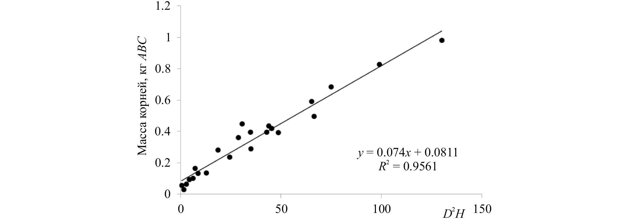 Рис. 2. Аппроксимация зависимости массы корней сосны обыкновенной в древостоях II класса возраста на Кольском полуострове от таксационных характеристик деревьев (D2 H). По вертикали – масса корней в кг АСВ, по горизонтали произведение квадрата диаметра на высоту модельных деревьев.