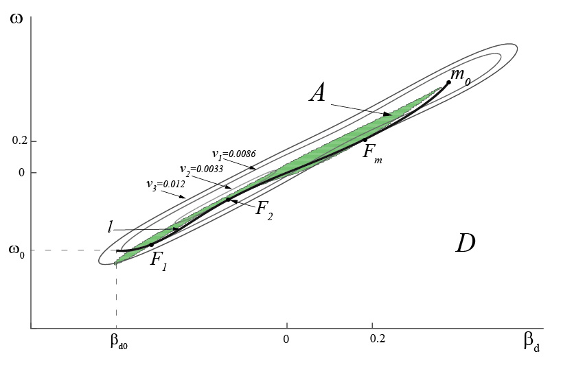 Рис. 7. Объект: “Волгонефть-71”. Фазовая плоскость с областями (A) и (D) (метод [7]), изолиниями фазовых скоростей ν1 = 0.0086 , ν2 = 0.0033, ν3 = 0.012 (метод годографа фазовой скорости); l — фазовая траектория. Начальные условия: точка (βd0 =-0.4, ω0 =-0.5); U = 5°, U∈[UBIF,Um].
