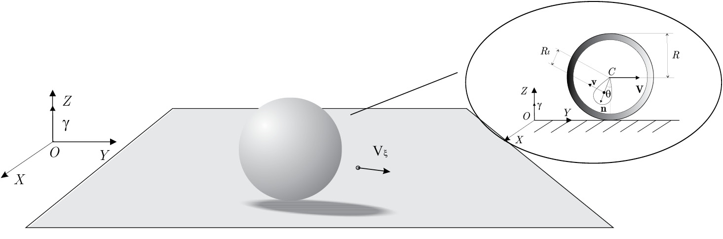Уравнения движения для сферической оболочки с закрепленным в геометрическом центре волчком Лагранжа, катающейся по неподвижной горизонтальной плоскости, получены в [23]. Запишем уравнения движения сферического робота с маятниковым приводом, на движение которого наложены кинематические связи (2.1)–(2.2):