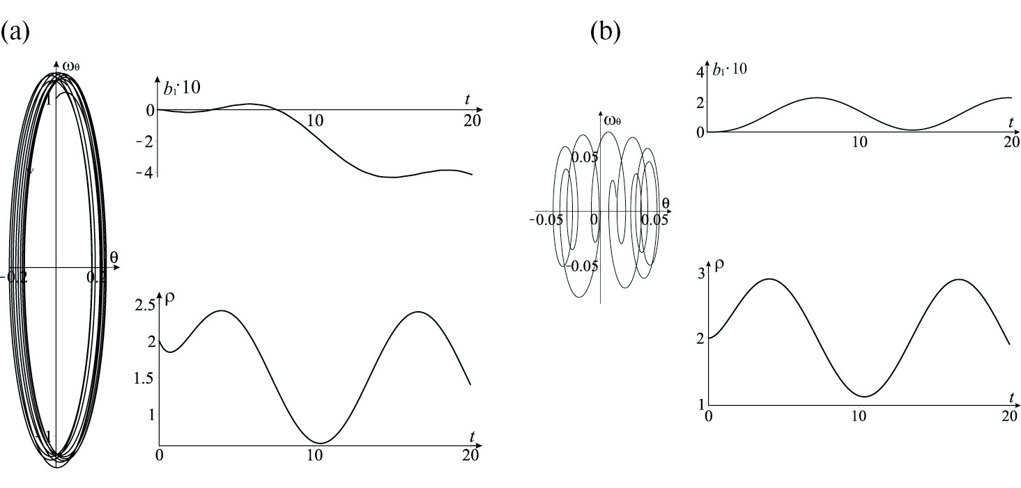 Замечание 3. Отметим, что система (3.5) имеет особенность в точках что является исключительно следствием выбора переменных. Особенность пропадает при движении робота по прямой. Также при свободных колебания маятника проблему можно решить соответствующим выбором начального условия так как характеризует неустойчивое положение маятника. Однако, при управлении сферическим роботом посредством маятникового привода выбор соответствующего начального значения не решит проблему. Поэтому при движении робота по криволинейной траектории имеет смысл интегрировать в исходных переменных.