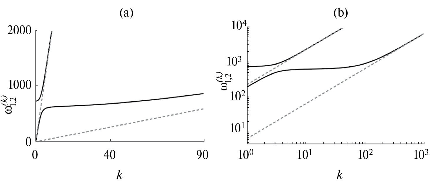 Рис. 5. Графики зависимости собственных частот от k при H2 = 0: (а) линейный масштаб, (b) логарифмический масштаб.