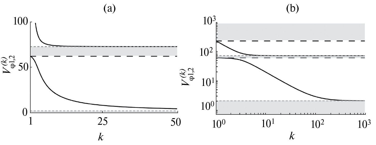 На рис. 3 изображена фазовая скорость от параметра k (черная сплошная линия). Ветвь, соответствующая ω2, расположена выше ветви, соответствующей ω1. Ветвь vφ2(k) на бесконечности подходит к своей асимптоте сверху (H2 /( jρ))1/2, ветвь vφ1(k) на бесконечности к (Na /ρ)1/2 сверху. Отметим, что область изменения vφi(k) распадается на три части: ветвь vφ2(k) ограничена сверху значением при k = 1 (на рис. 3, b черная пунктирная линия) и асимптотой на бесконечности (серая пунктирная линия), аналогично vφ1(k) со своими значениями.