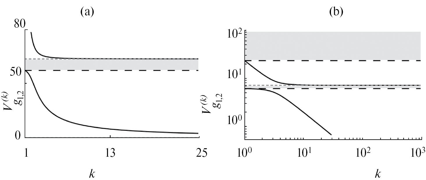 На рис. 4 показана зависимость групповой скорости от волнового числа (черная сплошная линия). При этом ветвь, соответствующая ω2 при k = 1, расположена ниже ветви, соответствующей ω1. Однако на бесконечности ветвь, соответствующая ω2, расположена выше ветви, соответствующей ω1. Обратим внимание, что ветвь vg2(k) на бесконечности подходит к своей асимптоте снизу (H2/( jρ))1/2, как и vg1(k) к (Na /ρ)1/2 тоже снизу, однако последняя вначале пересекает асимптоту, имеет точку перегиба и только после этого уходит на бесконечность снизу к своей асимптоте. Особенно отчетливо это видно в логарифмическом масштабе на рис. 4, b.