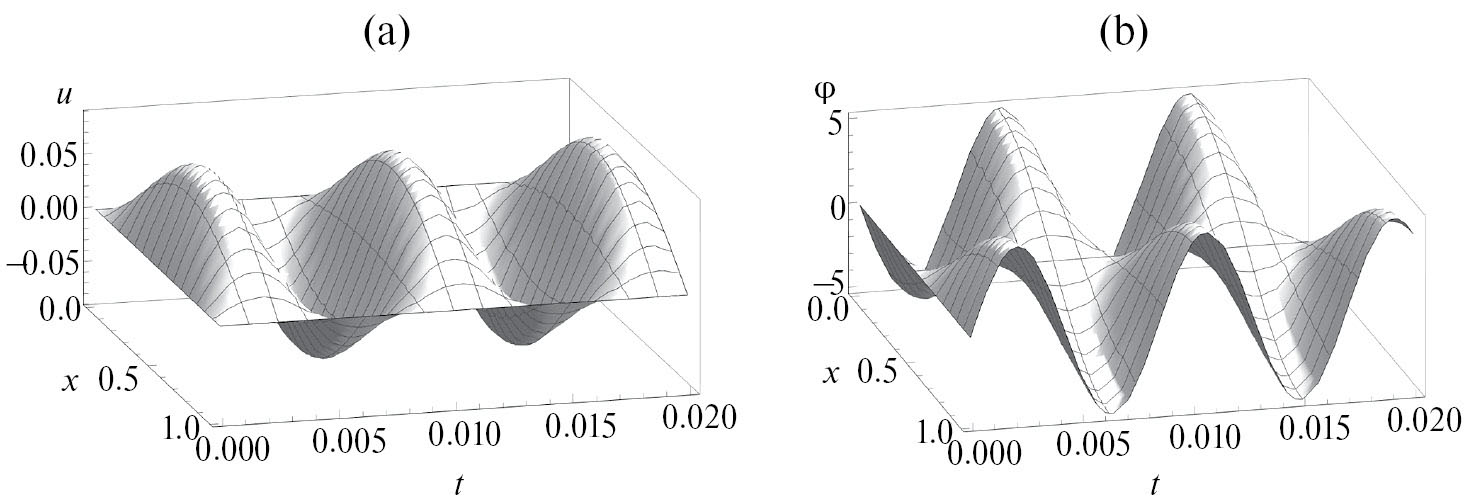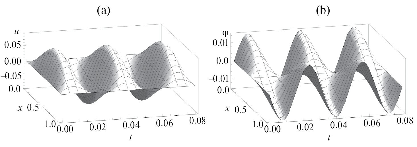 Случай 2. Теперь пусть перемещения и повороты включений зависят от времени и координаты x1, т.е. u = u(x1, t) и φ = φ(x1, t), кроме того, потребуем, чтобы u2 = 0. Тогда система (2.1) принимает вид: