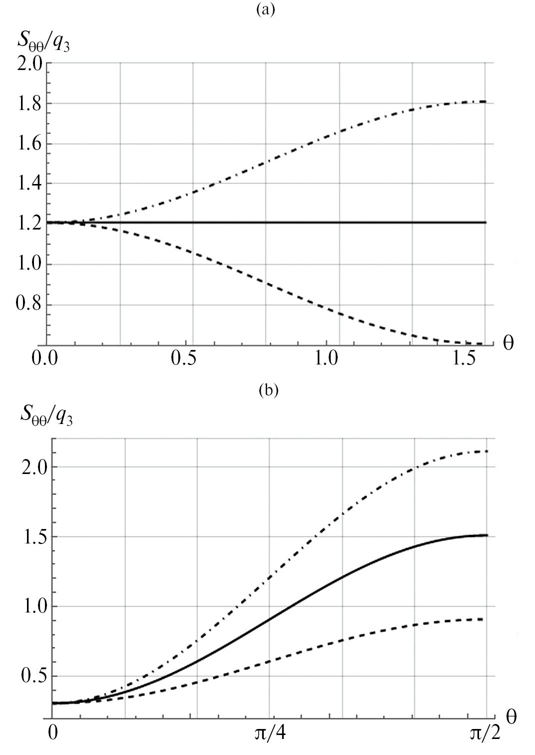 Рис. 1. Зависимости окружных напряжений на контуре горизонтальной скважины, нормированных на значение вертикального напряжения, от угла, отсчитываемого от вертикали; а) при равнокомпонентном исходном напряженном состоянии массива, b) при коэффициенте бокового распора 0.7; сплошные линии - при гидростатическом пластовом давлении; пунктирные линии - при максимальной закачке; штрих-пунктирные линии - при максимальном отборе газа.