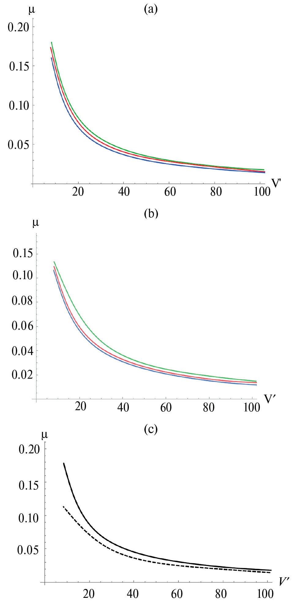 Рис. 5. Зависимость коэффициента трения от скорости для изолированной неровности (a), множественного контакта (б): c = 10, A′ = 1/3, Q ′ = 1.23 (на 9 неровностей), Q ′ = 0.137 (на одну неровность), n = 1 (красная), n = 2 (зеленая), n = 4 (синяя); (c) – сравнение результатов для единичного контакта (сплошная кривая) и множественного контакта (штриховая кривая) при n = 2.