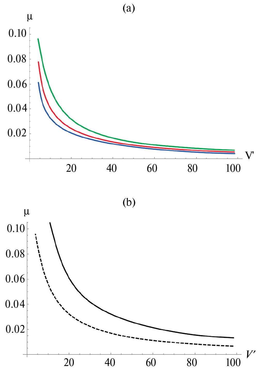 Рис. 6. Зависимость коэффициента трения от скорости для множественного контакта (a): H ′ = 3.3 · 10–6, c = 10, A′ = 1/3, Q ′ = 1.23 (на девять неровностей), Q ′ = 0.137 (на одну неровность), n = 1 (красная), n = 2 (зеленая), (синяя); (b) – сравнение результатов для единичного контакта (сплошная кривая) и множественного контакта (штриховая кривая) при n = 2.