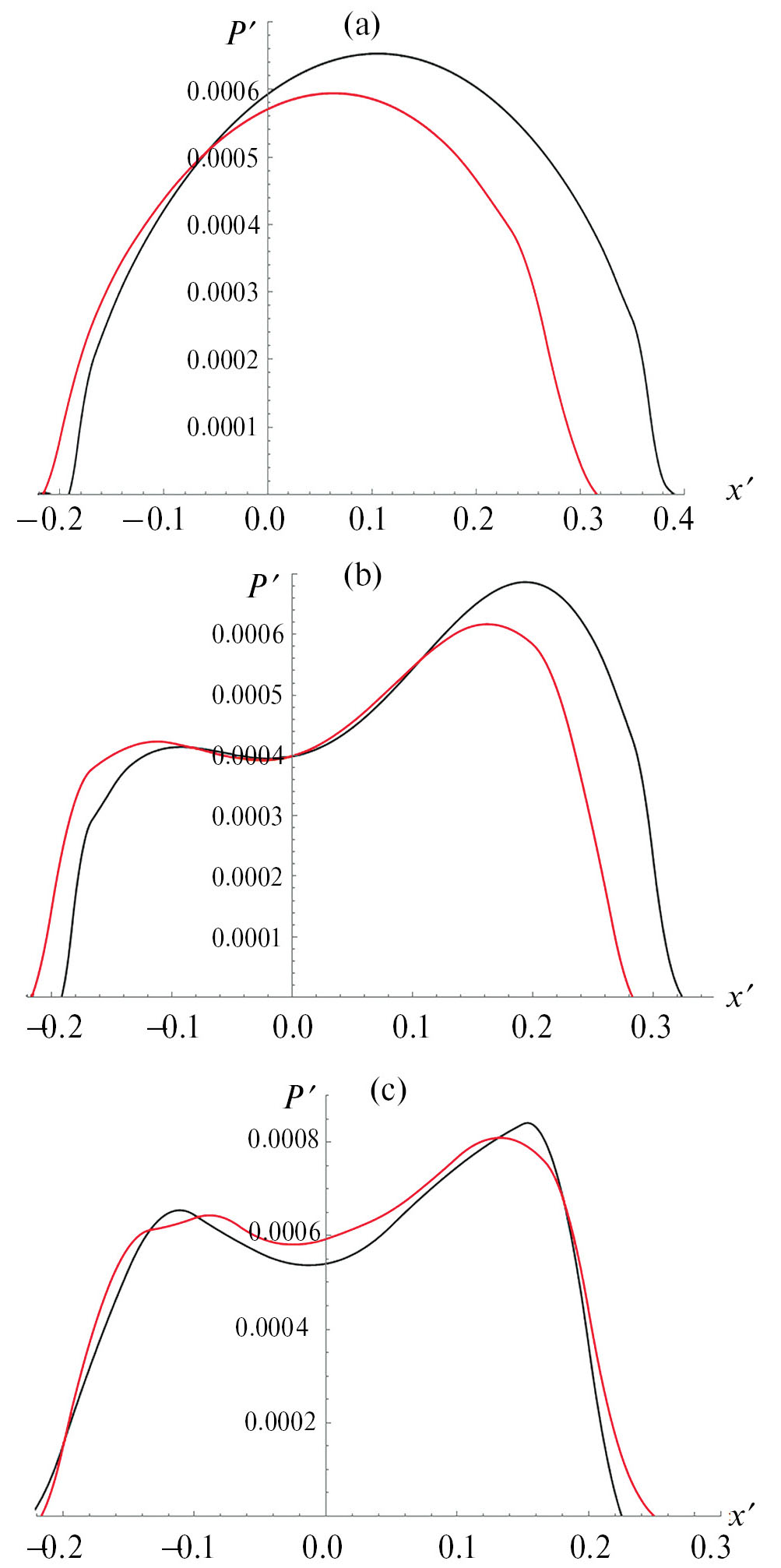 Рис. 7. Распределение контактного давления при n = 1 (a), n = 4 (b, с): H ′ = 3.3 · 10–4 (a, b), c = 10, A′ = 1/3, V ′ = 8.20, (на девять неровностей), Q ′ = 0.137 (на одну неровность); изолированная неровность (черные кривые), множественный контакт (красные кривые); (с) – распределения контактного давление при: n = 4 (красная кривая), H ′ = 3.3 · 10–3 (черная кривая).