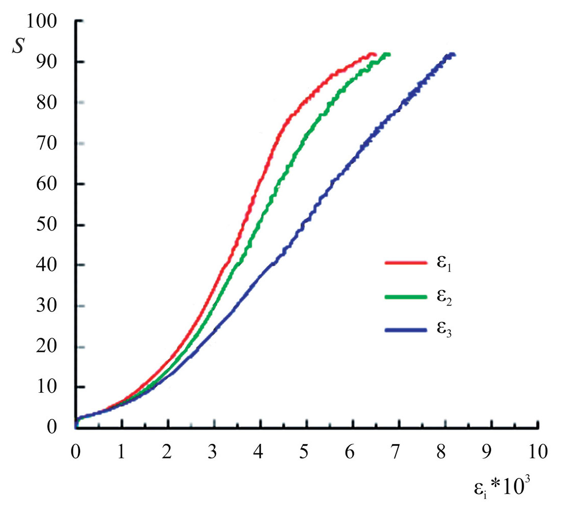 На рис. 8 приведены кривые деформирования образца П 10-4 по трем осям в зависимости от параметра нагружения S2.