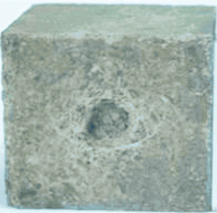 На рис. 4 приведена фотография образца после опыта. На ней видно, что отверстие в образце после испытания оказалось сильно деформированным и забитым разрушенной породой.