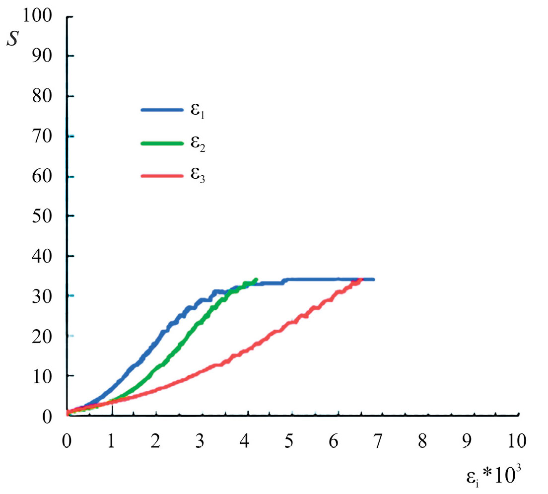 Рис. 6. Кривые деформирования образца с отверстием 20 мм: S – напряжение обжатия образца, МПа; – деформации по трем осям образца