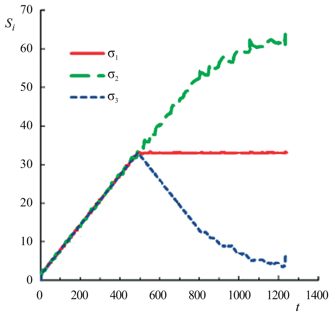 Рис. 7. Программа нагружения образца П 10-4: Si – напряжения, прикладываемые к граням образца, МПа; t – время, с