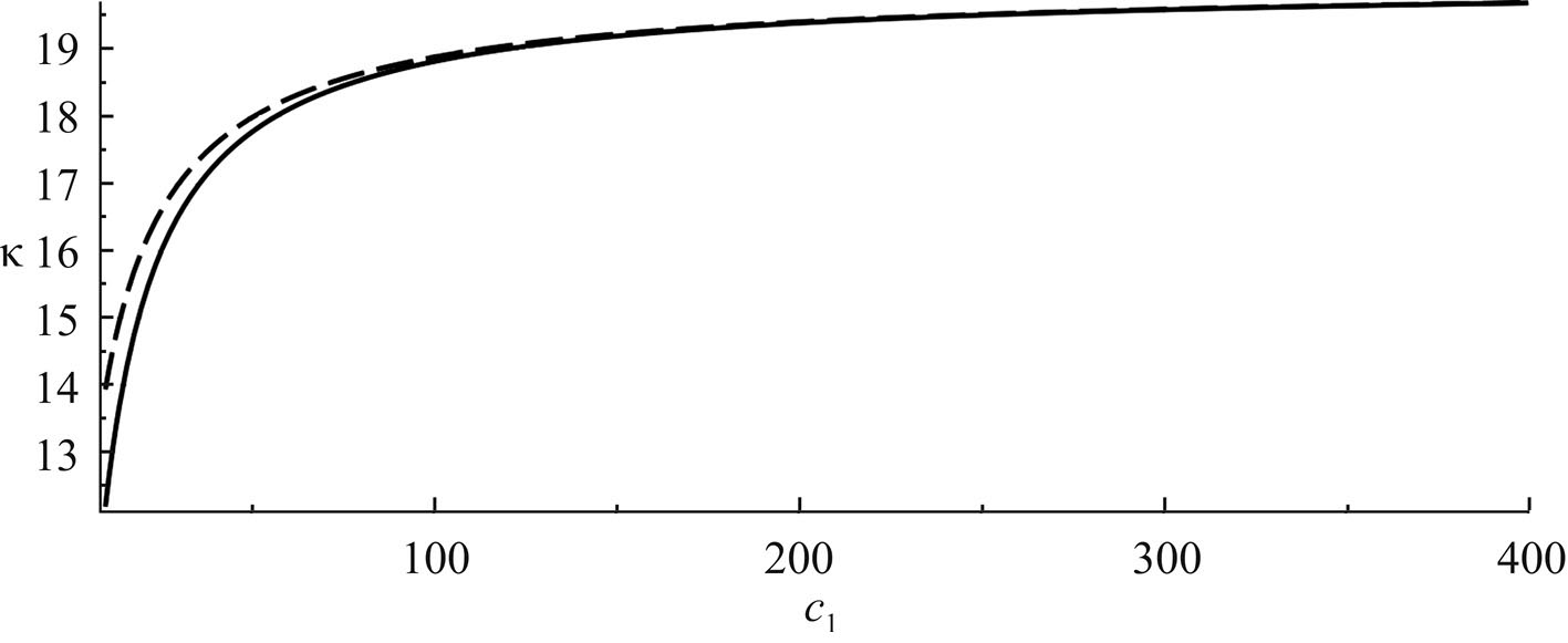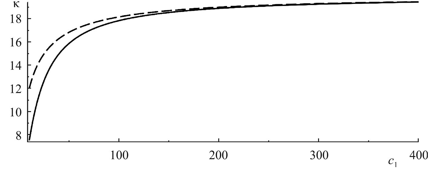 Рис. 2. Собственное значение k: по (4.12) – сплошная линия, по (4.16) – пунктир