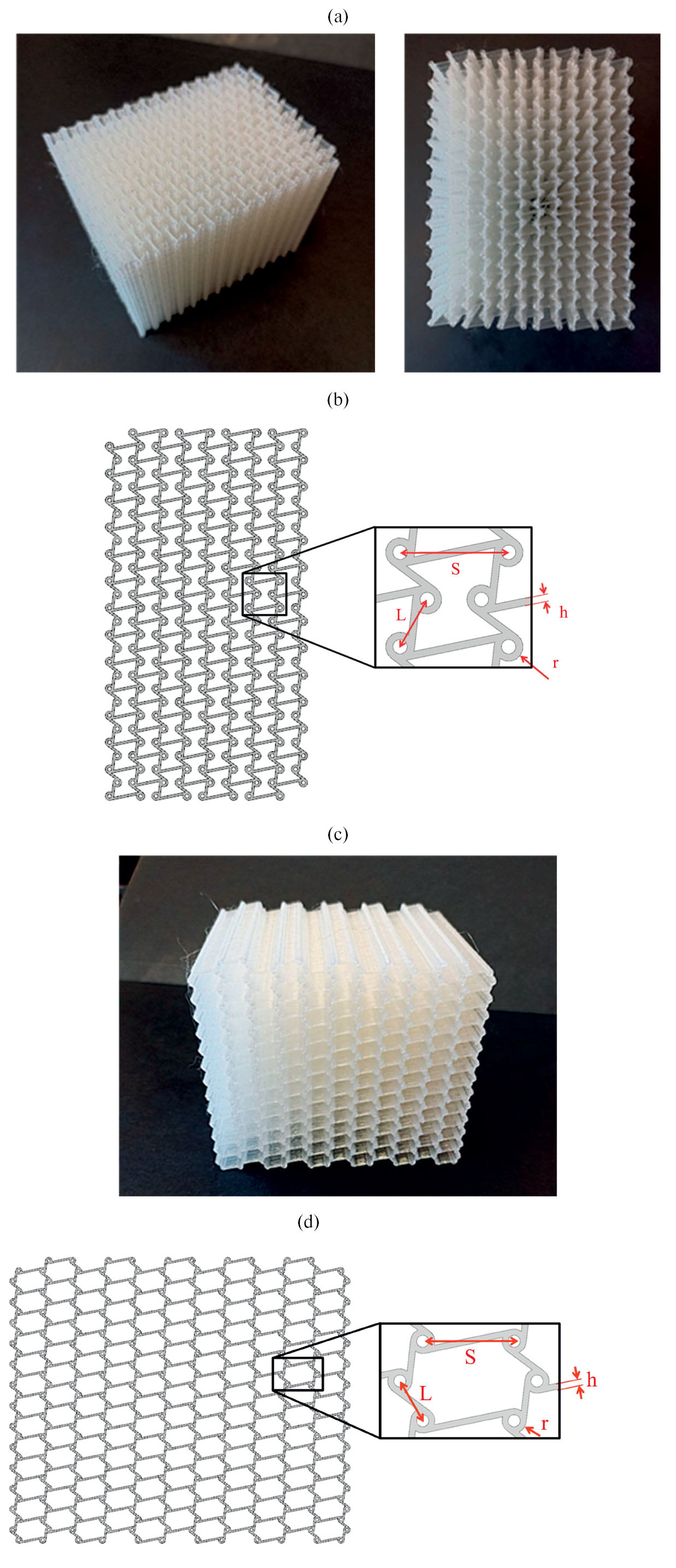 Рис. 1. Образцы метаматериалов и их внутренняя хиральная структура: а), b) – ауксетические; c), d) – неауксетические. На рис. (b) и (d) S = 6 мм, L = 3 мм, h = 0.4 мм, r = 0.8 мм