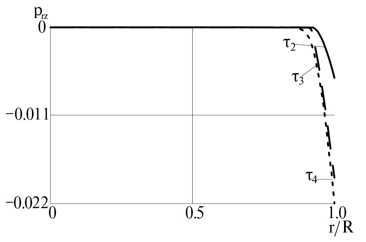 Из первой формулы (3.7) следует, что p1 является линейной функцией координаты z. Функцию интегрирования c1(t) полагаем равной нулю, чтобы напряжение srz имело конечное значение при r = 0, c1(t) найдем из граничных условий (3.1). Тогда компонента srz тензора напряжений принимает окончательный вид