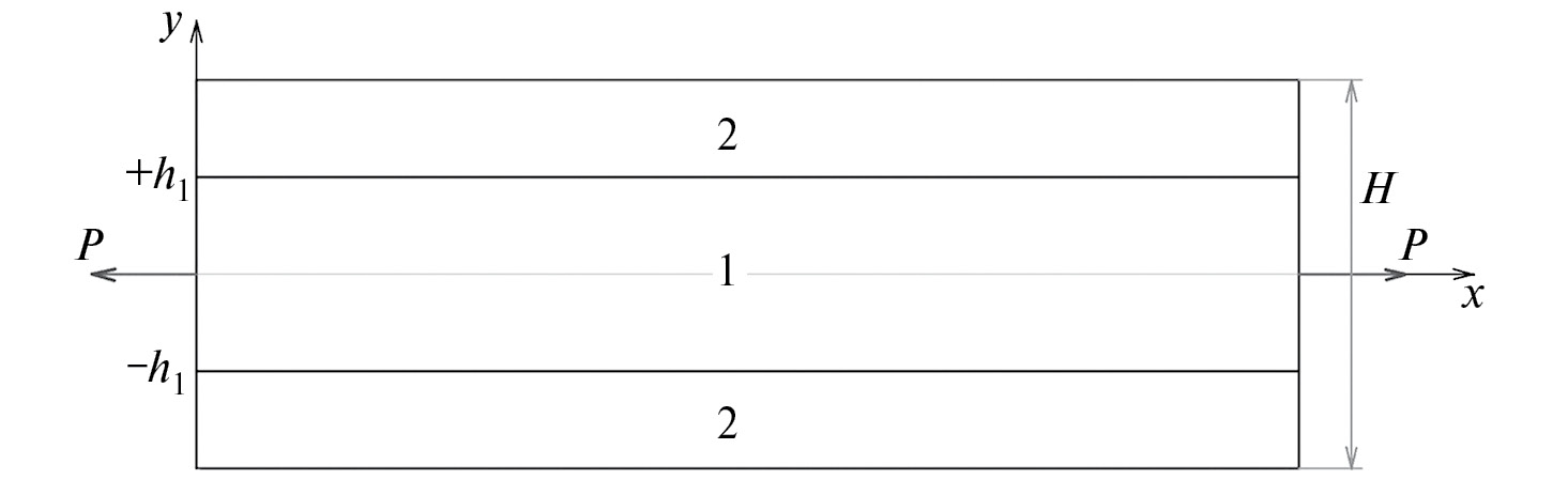 2.Постановка задачи. Рассматривается составной стержень, находящийся в состоянии установившейся ползучести под действием постоянной растягивающей силы P, приложенной к его торцам. Стержень имеет прямоугольное поперечное сечение, длина стержня L, ширина стержня H и толщина b удовлетворяют двойному неравенству L >> H >> b. Расположение частей симметрично относительно срединной плоскости, проходящей через геометрическую середину ширины H. Центральная часть стержня выполнена из материала, обладающего одними свойствами ползучести, две крайних одинаковых части выполнены из другого материала, который обладает другими свойствами ползучести. Дополнительно примем следующее условие: все части составного стержня жестко, без проскальзывания соединены между собой. Расположение частей в стержне представлено на рис. 1.