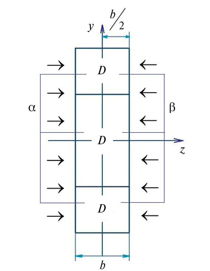 Исследуется длительная прочность растягиваемого длинного составного стержня с поперечным сечением в виде узкого прямоугольника в активной среде, диффузионное влияние которой описывается уравнением (2.1). Поскольку ширина H поперечного сечения значительно превосходит его толщину b, то влиянием диффузии со стороны узких сторон прямоугольного сечения можно пренебречь. Длина стержня во много раз превосходит характерные размеры его поперечного сечения, поэтому влиянием продольной координаты стержня на диффузионный процесс можно также пренебречь. Таким образом, процесс диффузии является одномерным и проходит по толщине b вдоль поперечной координаты z. Принимаются одинаковые граничные условия диффузионного процесса на широких сторонах прямоугольного поперечного сечения, в связи с этим процесс диффузии является симметричным относительно оси y, проходящей через центр поперечного сечения стержня. Примем одинаковые характеристики диффузионного процесса для центральной части и двух крайних частей стержня. А именно, пусть активная среда проникает в центральную и крайние части с коэффициентом диффузии D = const. Вероятности перехода a связанной формы молекул активной среды в свободную и обратный процесс b примем одинаковыми для всех частей стержня. Схема воздействия активной среды на составной стержень представлена на рис. 2.