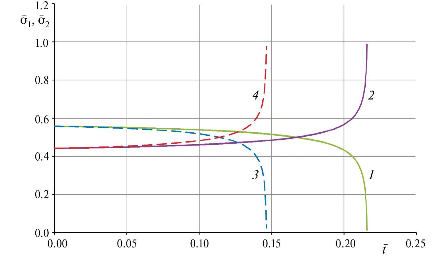 Рис. 3. Зависимости безразмерных напряжений от безразмерного времени в частях составного стержня при учете неклассического (обозначения: 1, 2) и классического (обозначения: 3, 4) диффузионных процессов.