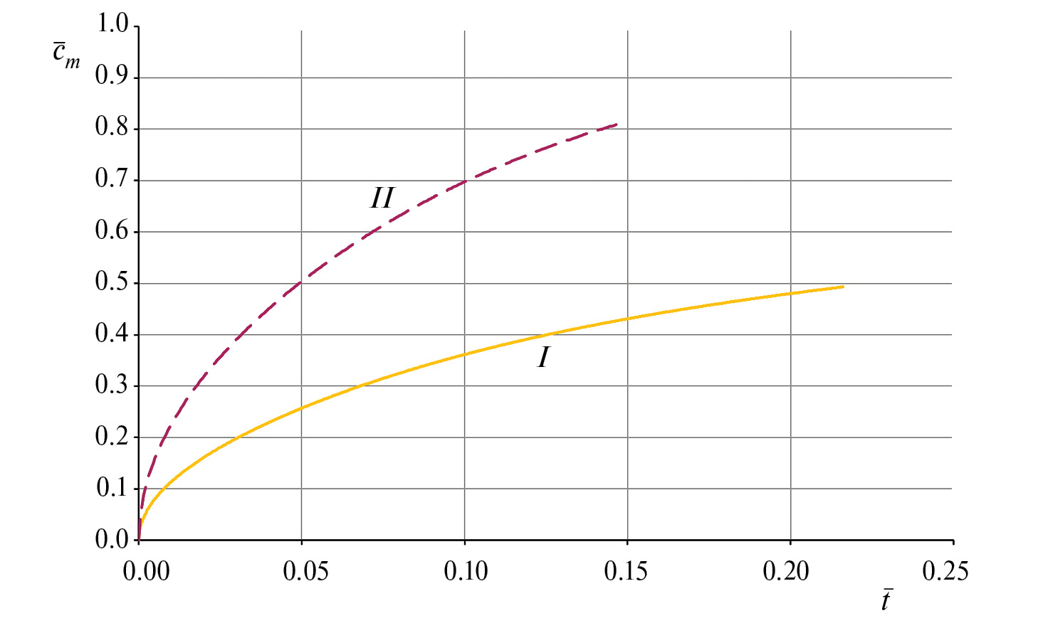 Разрушение определяется критериально предельным значением поврежденности * ≡ 1. Разрушение в классическом случае происходит раньше (при = 0.147) , чем в случае рассматриваемого неклассического диффузионного процесса (при = 0.216). Этот факт дополнительно подтверждают зависимости интегрально средней концентрации () от безразмерного времени (рис. 6). Для случая классической диффузии график соответствующей зависимости () проходит выше, чем аналогичный график для случая неклассического диффузионного процесса. То есть, в последнем случае меньше концентрация свободной (диффузионной) составляющей, чем в классическом случае. Это происходит по причине дополнительного расхода вещества на образование связанной формы.