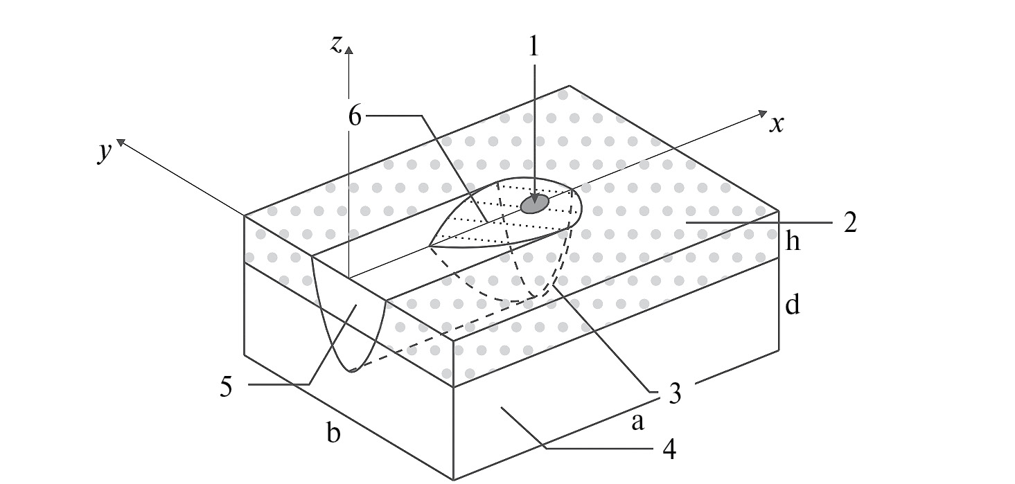Рис. 1. Графическая схема задачи о подвижном тепловом потоке от лазерного луча 1 при его воздействии на слой порошка 2 с образованием ванны расплава 6. Цифрой 3 обозначена подвижная фазовая граница, 4 – подложка из материала в твердой фазе, 5 – остывший след лазера в виде материала в твердой фазе.