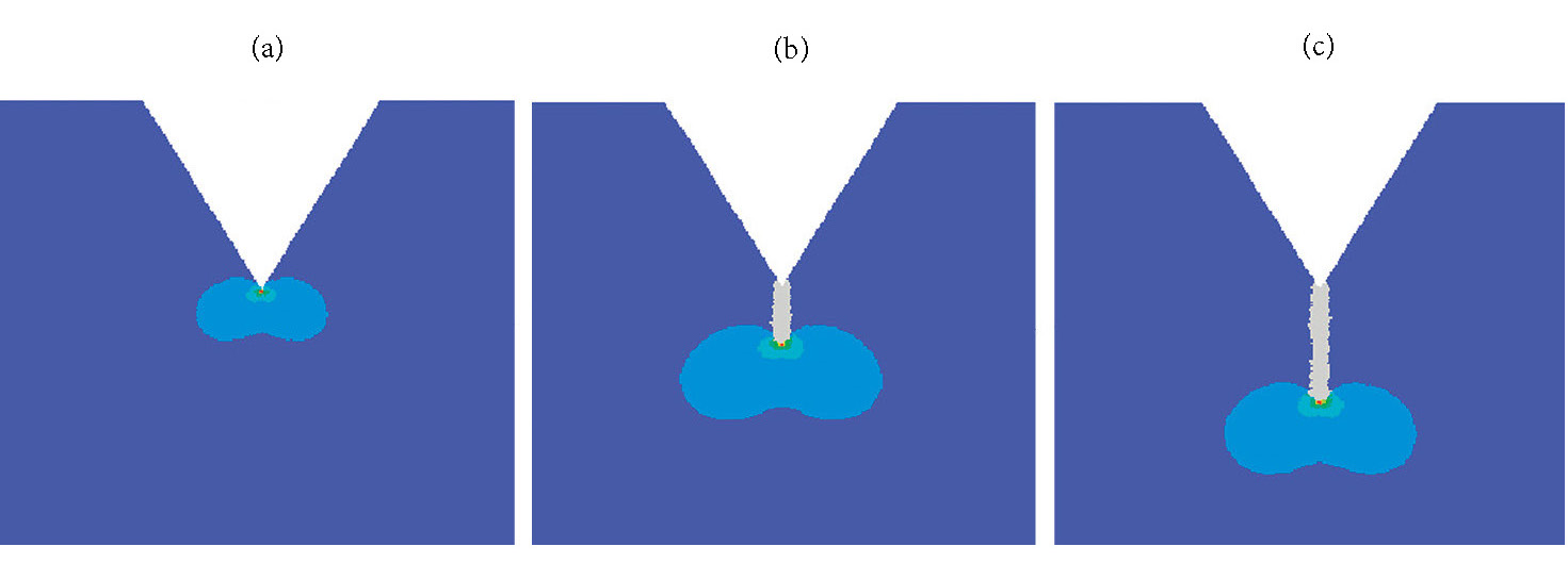 Рис. 9. Примеры расчета зарождения и развития квазитрещин. Зарождение квазитрещины – a), ее развитие до длины 1 мм – b), ее развитие до длины 2 мм – c).