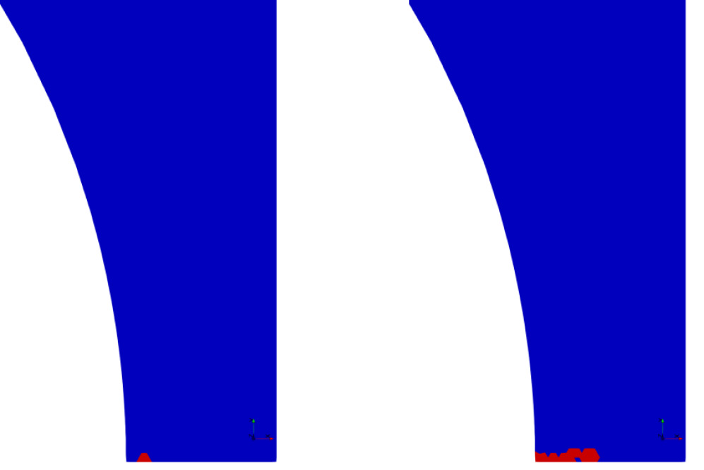 На рис. 12 красным цветом изображены зоны полного разрушения (квазитрещины) в момент зарождения при количестве циклов N = 1.31Е+09, рис. 12, а, и в момент, когда квазитрещина продвинулась почти на половину расстояния до оси образца при N = 1.33Е+09, рис. 12, b. Эти зоны по расположению и количеству циклов практически идентичны и для линейной, и двухслойной системы дефектов. Число циклов N =1.33Е+09 можно считать соответствующим макроразрушению образца, так как дальнейшее продвижение квазитрещины происходит практически без изменения этого значения с шагом ~105–106 циклов. Большее число слоев с дефектами не рассматривалось, так как более удаленные от горизонтальной оси образца дефекты практически не влияют на процесс развития повреждений, поскольку расположены в более широкой части образца с меньшим уровнем амплитуд напряжений.