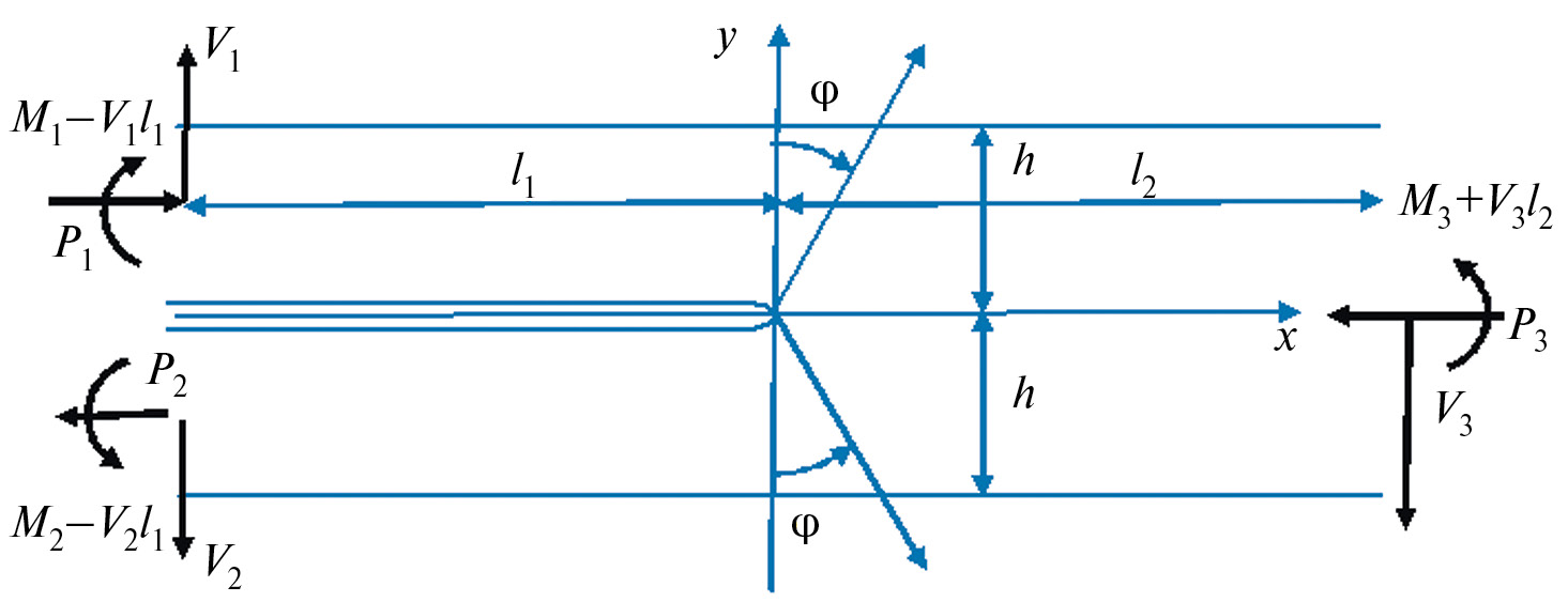 Нагрузка в виде трех изгибающих моментов M1, M2, M3, трех продольных P1, P2, P3 и трех поперечных сил V1, V2, V3 (рис. 1) приложена на достаточно большом расстоянии от вершины трещины так, чтобы считать его бесконечным. Для компенсации моментов, создаваемых поперечными силами, приложены дополнительные моменты .
