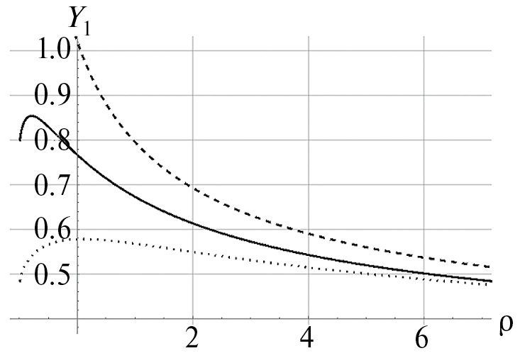 Рис. 2. Зависимость функции Y1 от p для ; сплошные линии , пунктирные линии , точечные линии .