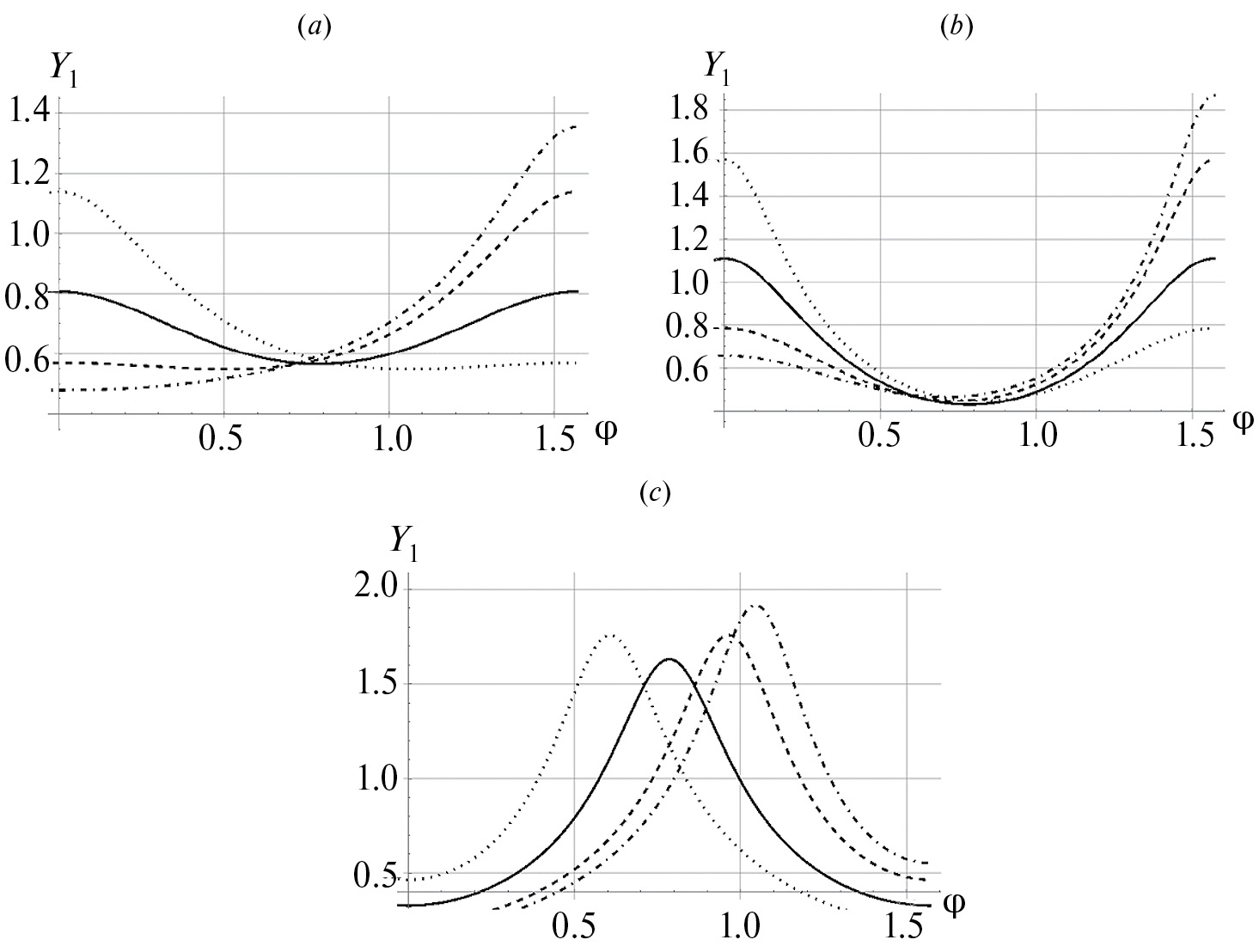 Рис. 3. Зависимость функции Y1 от : (a) для p = 2, (b) для p = 5, (c) для p = -0.7; сплошные линии – l = 1, пунктирные линии , штрих-пунктирные линии , точечные линии .