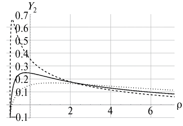 Рис. 4. Зависимость функции Y2 от p для ; сплошные линии , пунктирные линии , точечные линии .