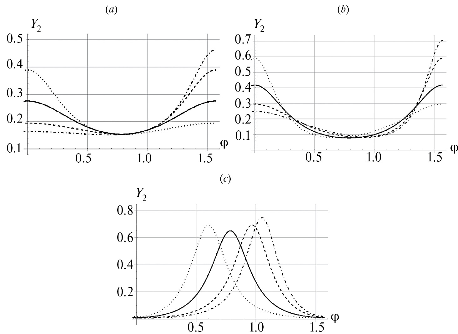 Рис. 5. Зависимость функции Y2 от : (a) для p = 2, (b) для p = 5, (c) для p = -0.7; сплошные линии , пунктирные линии , штрих-пунктирные линии , точечные линии .
