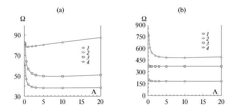 Рис. 5. Зависимость собственных частот колебаний сваи (Ω, Гц) от размеров цилиндра (А, м): при Egr = 1 МПа (a), при Egr = 100 МПа (b).
