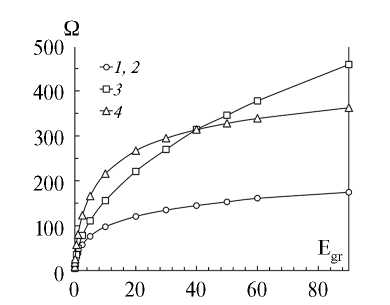 Для оценки влияния на эти зависимости коэффициента Пуассона грунта (νgr) были получены аналогичные зависимости при νgr = 0.01 и νgr = 0.49. Результаты численных экспериментов показали, что в этом диапазоне значений коэффициента Пуассона значения первых собственных частот изменяются в пределах 15%.