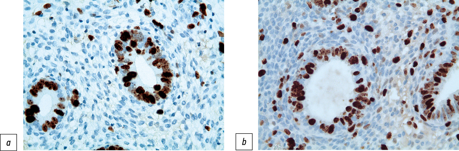 Рис. 6. Иммуногистохимическая реакция с маркёром Ki-67 в ткани гиперплазии эндометрия без атипии исходно в группе с эффективной терапией (а), неэффективной терапией (b) (ИГХ, ×400).