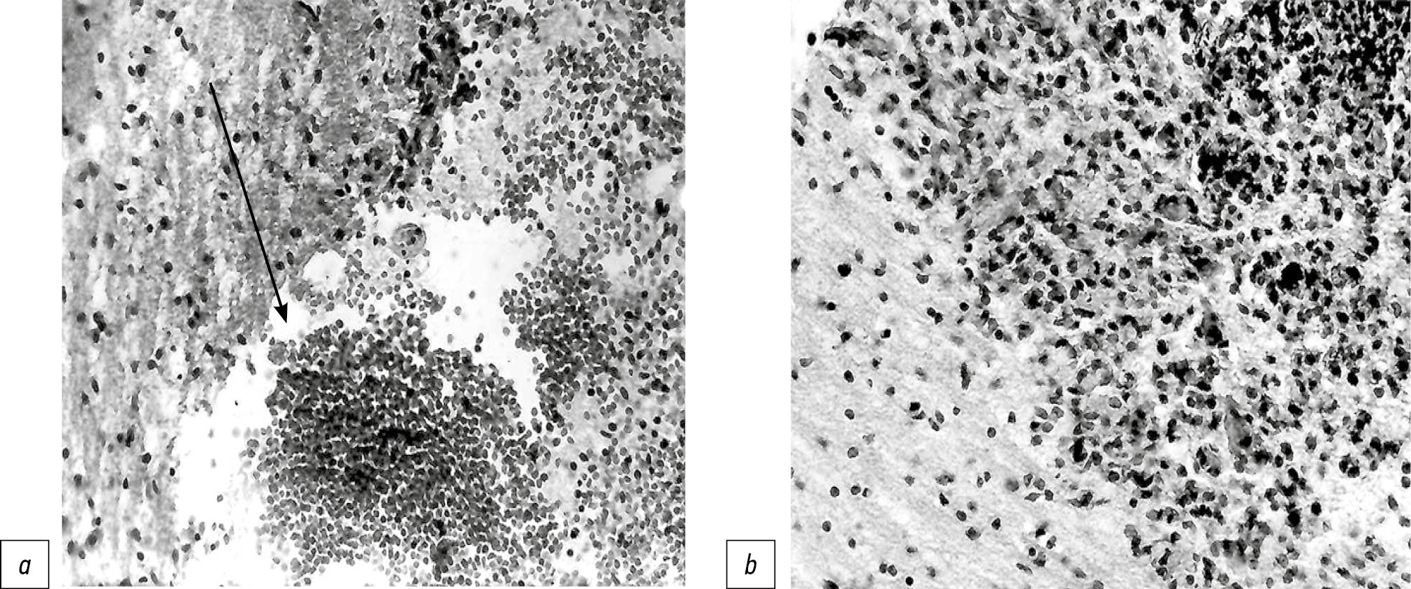 Fig. 3. The brain of a rabbit fetus, injured hemisphere: a — damage zone (on the 1st day after surgery); b — area of brain tissue close to the damaged area, proliferation of astrocytes with an admixture of a small amount of young connective tissue cells (on the 5th day after the operation). Stained with hematoxylin and eosin, ×400.